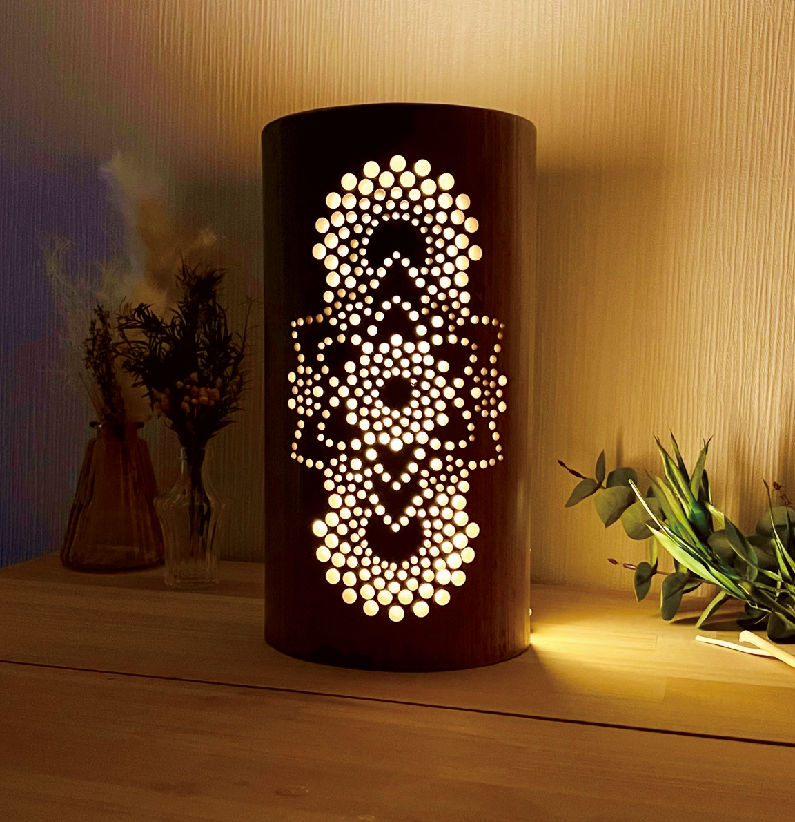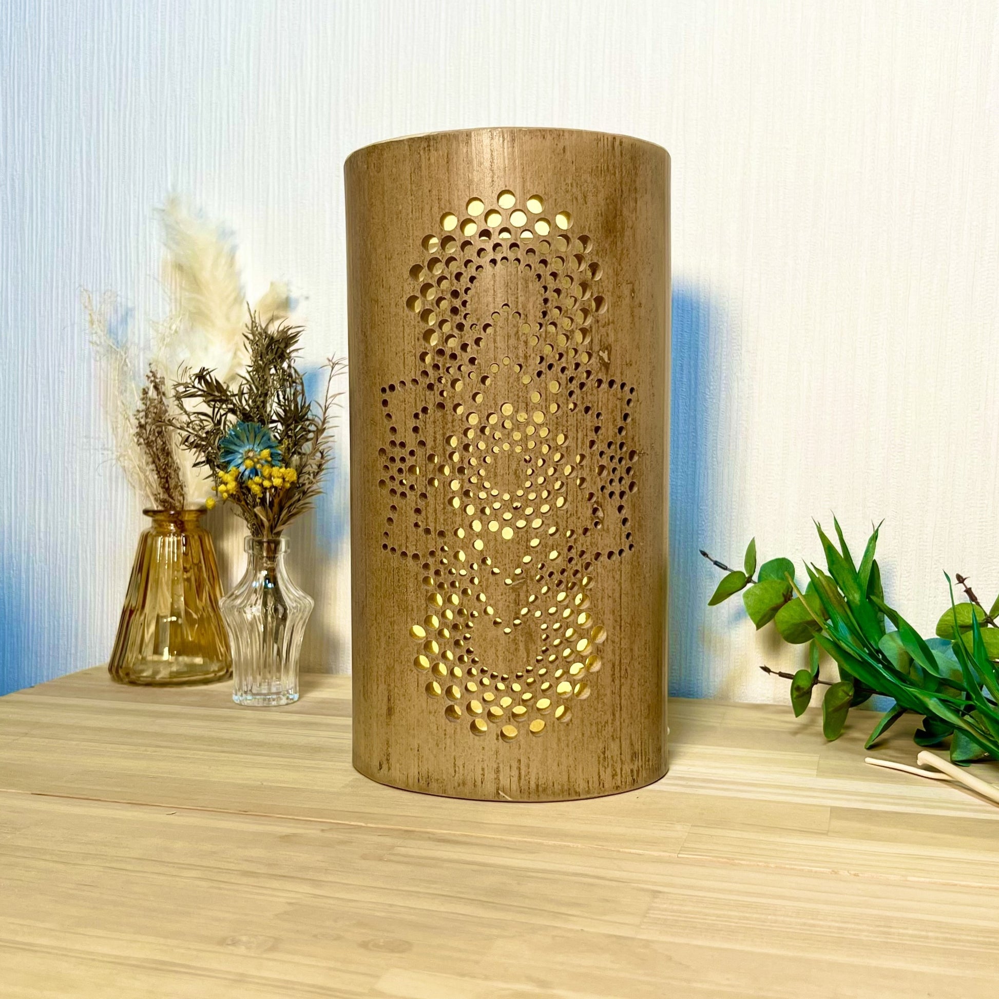 USBスイッチ付きライト(調光付き)は、光量が強い為、竹灯籠の高さ・柄の複雑さが増しても、灯した時に柄がハッキリと見えます。