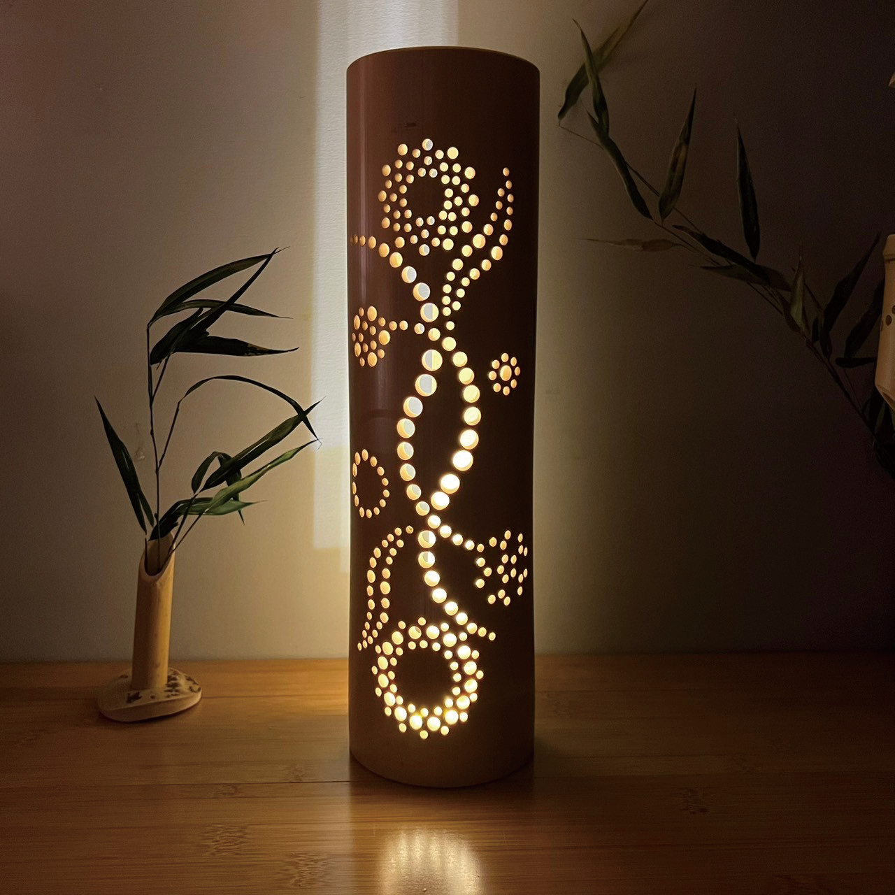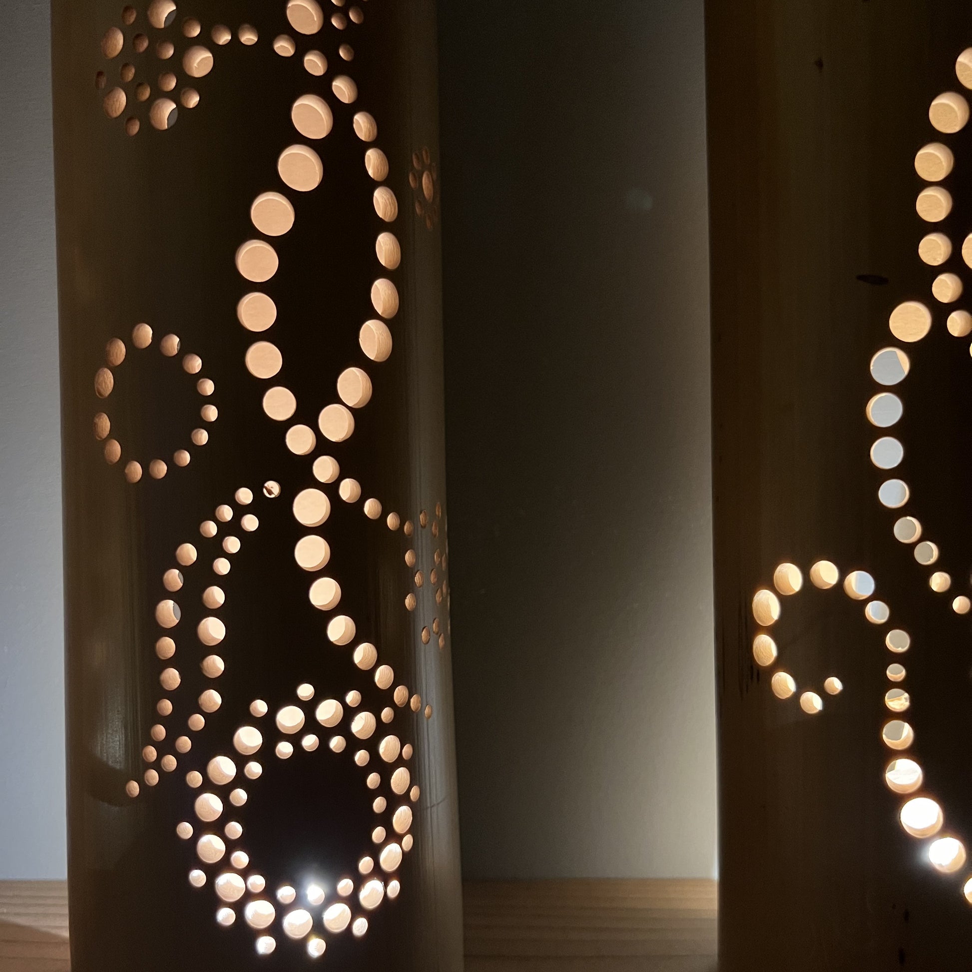 USBスイッチ付きライト(調光付き)は、光量が強い為、竹灯籠の高さ・柄の複雑さが増しても、灯した時に柄がハッキリと見えます。