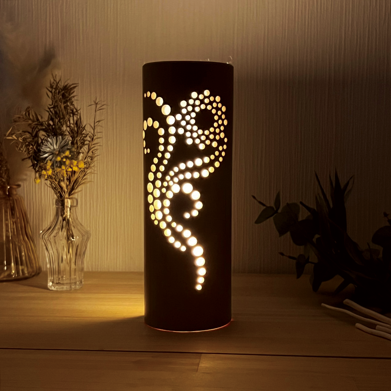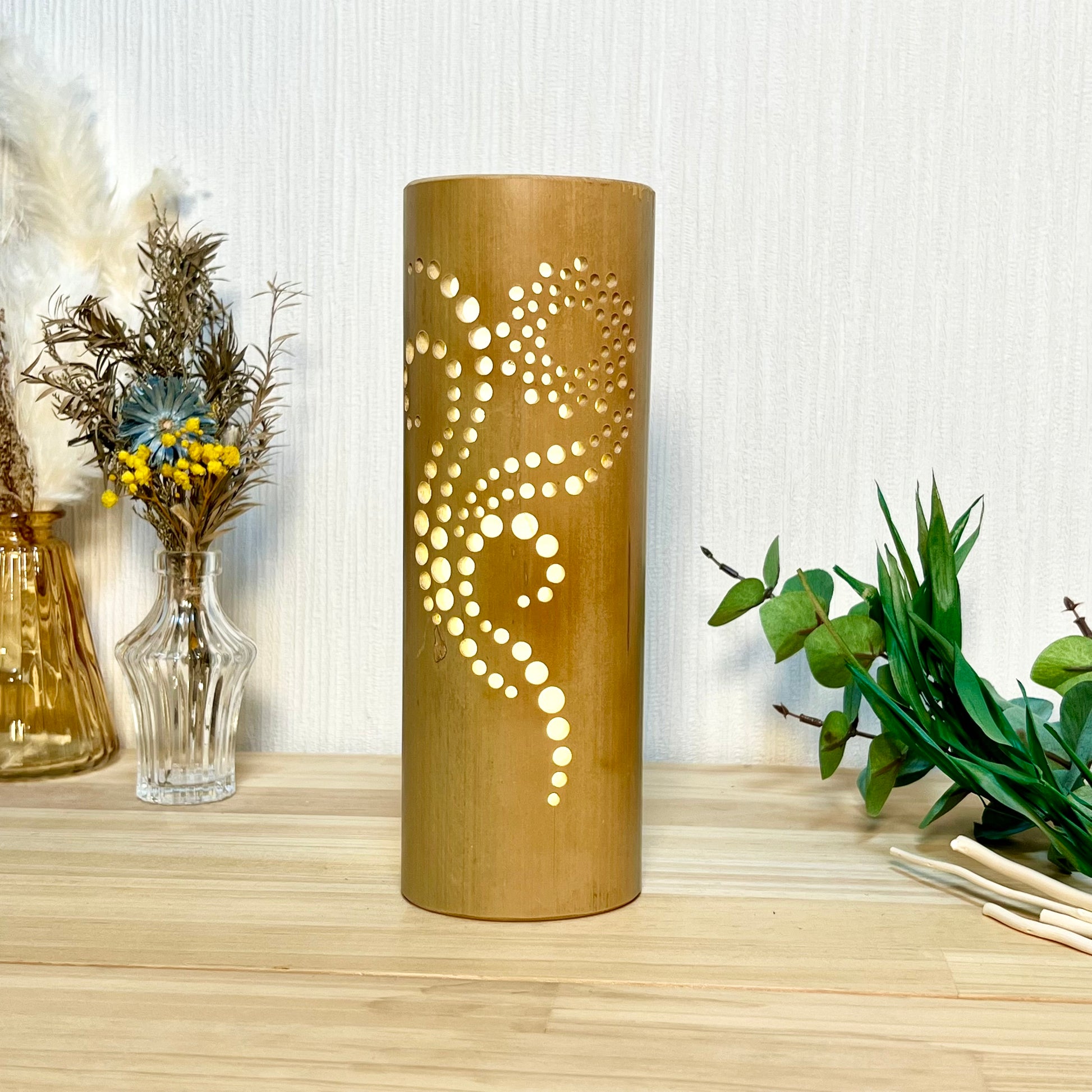 USBスイッチ付きライト(調光付き)は、光量が強い為、竹灯籠の高さ・柄の複雑さが増しても、灯した時に柄がハッキリと見えます。