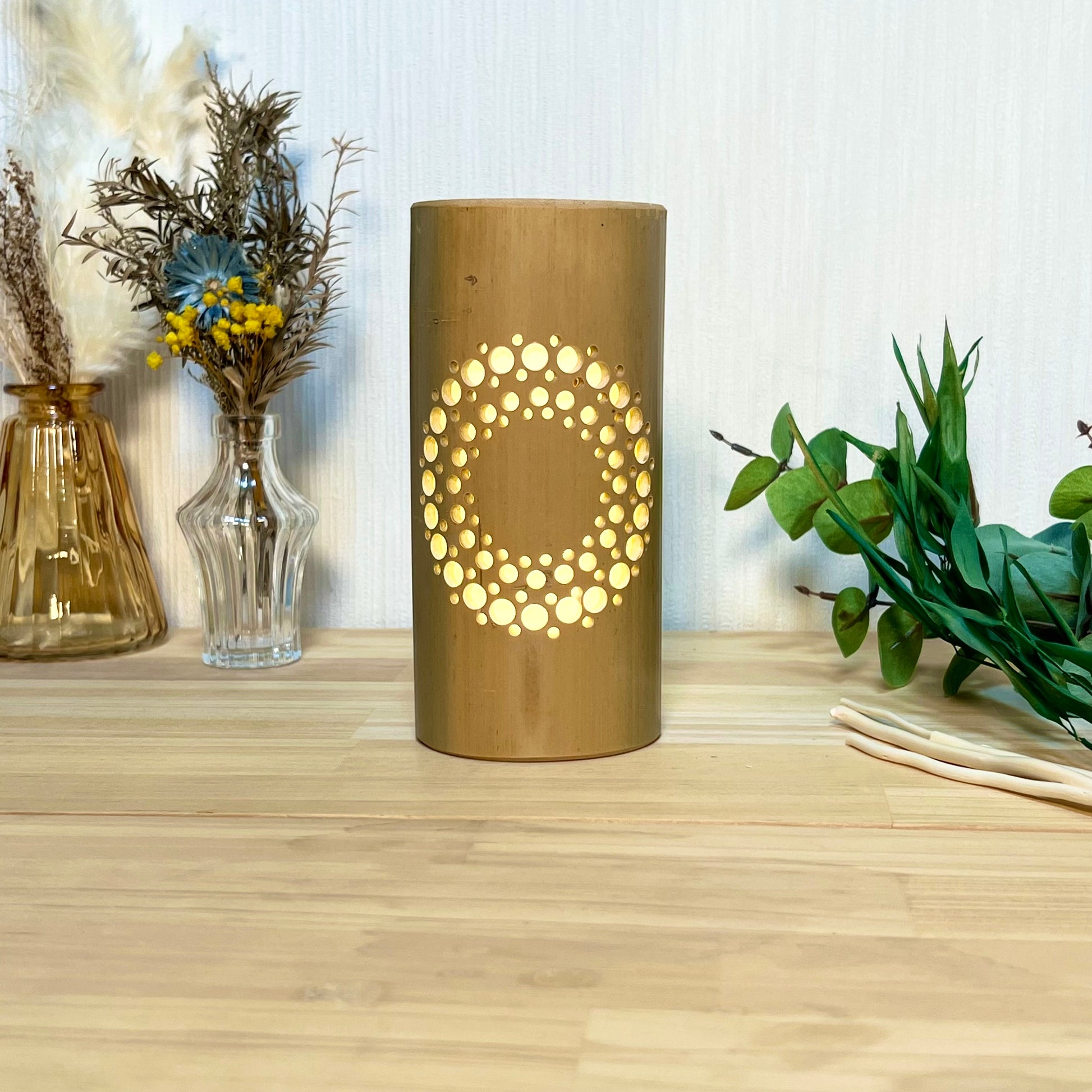 USBスイッチ付きライト(調光付き)は、光量が強い為、竹灯籠の高さ・柄の複雑さが増しても、灯した時に柄がハッキリと見えます。