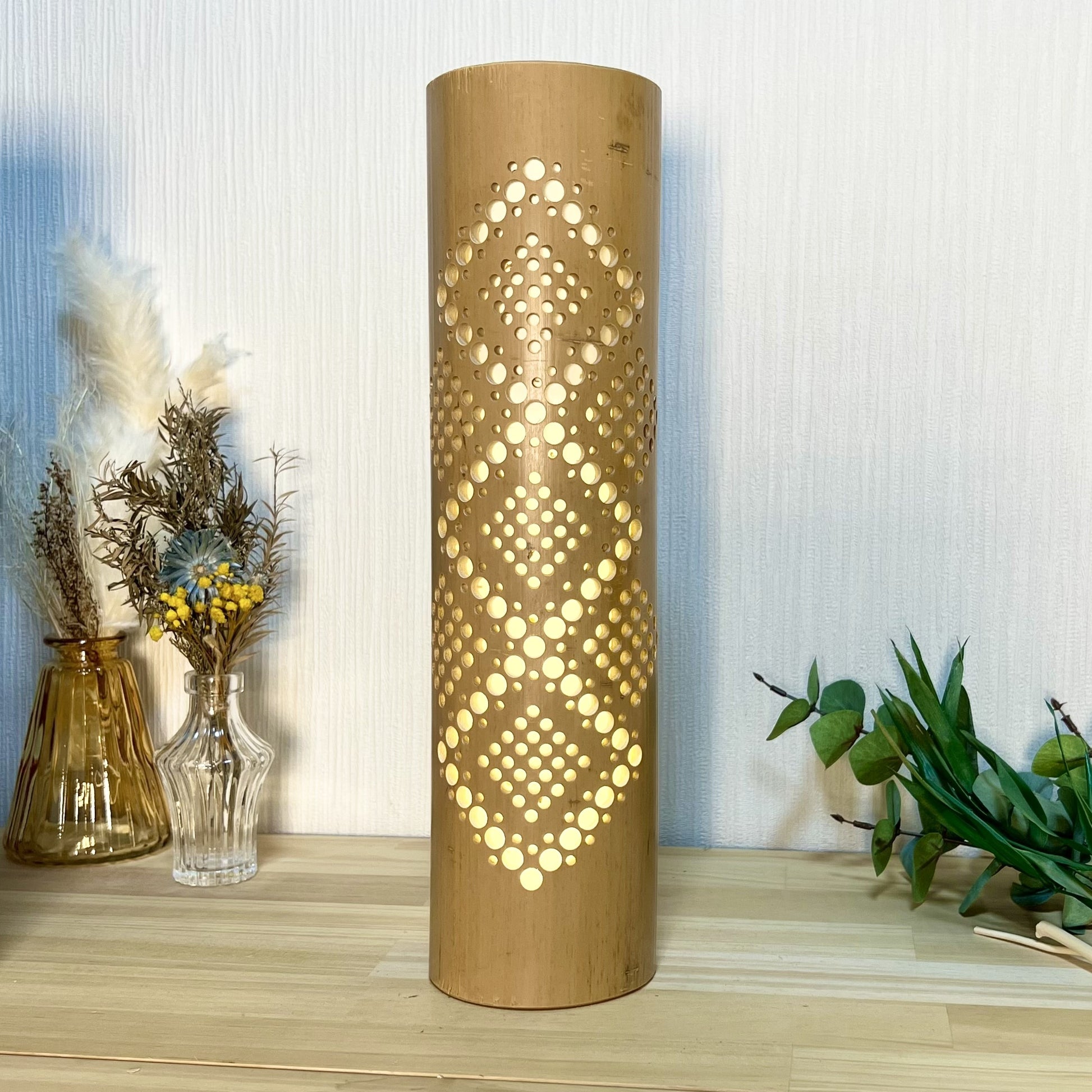 USBスイッチ付きライト(調光付き)は、光量が強い為、竹灯籠の高さ・柄の複雑さが増しても、灯した時に柄がハッキリと見えます。