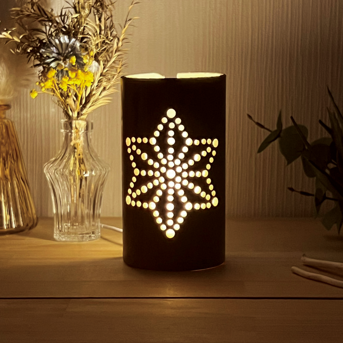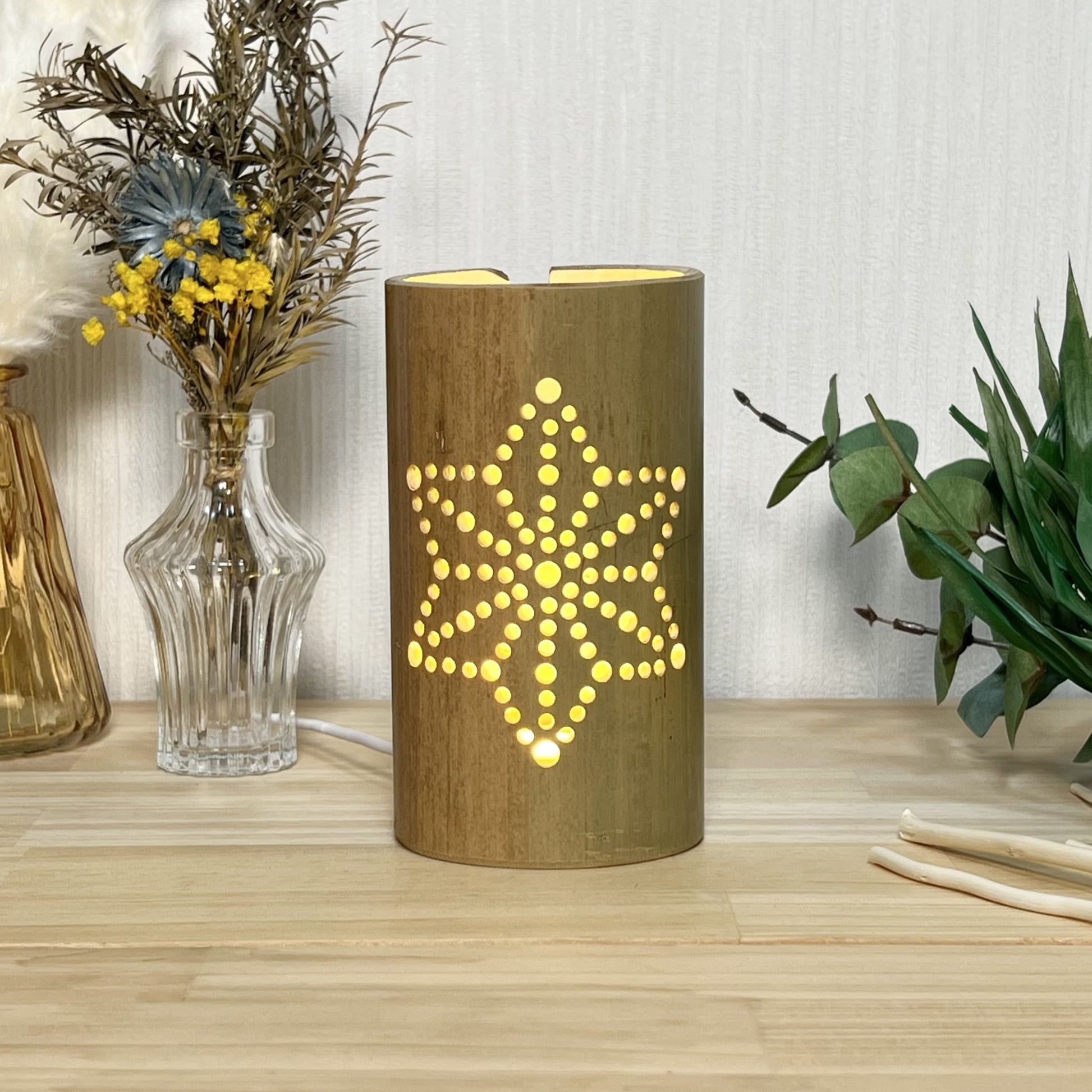 USBスイッチ付きライト(調光付き)は、光量が強い為、竹灯籠の高さ・柄の複雑さが増しても、灯した時に柄がハッキリと見えます。